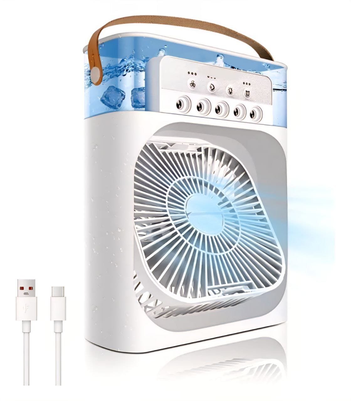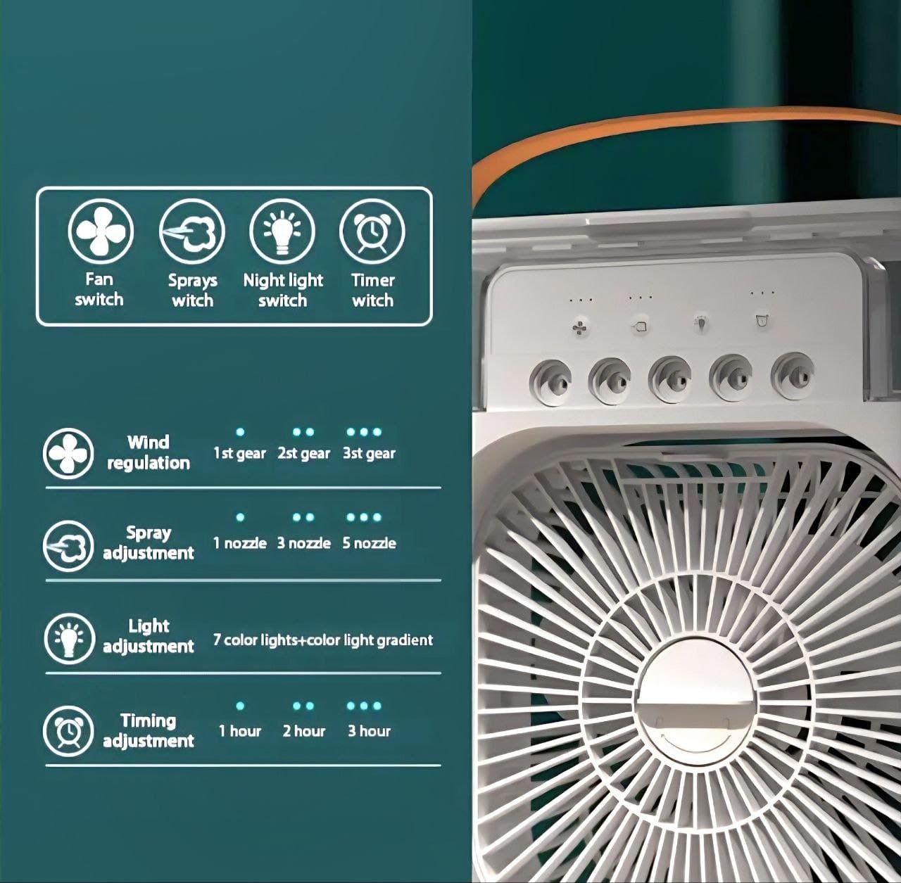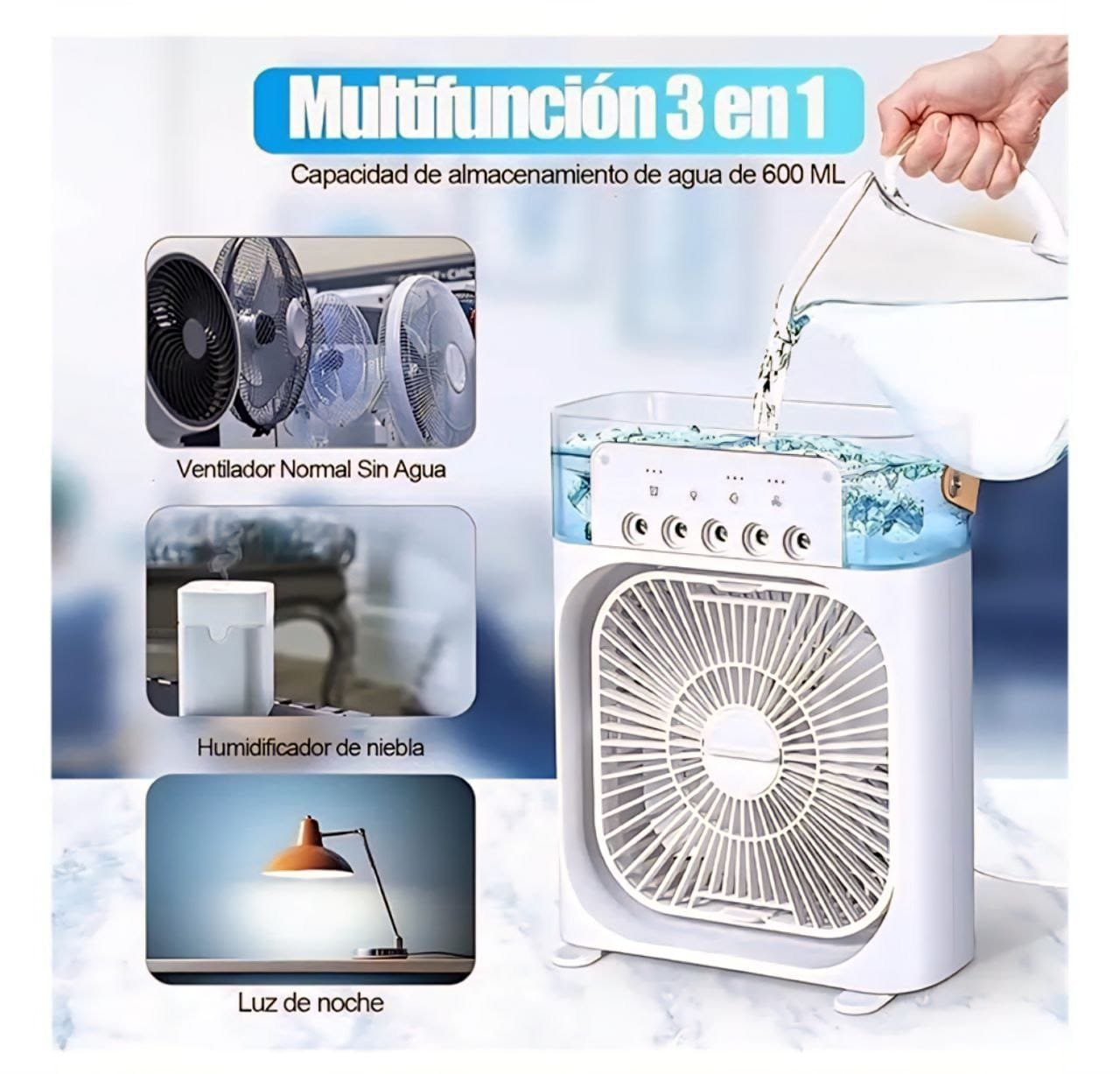 El ventilador incluye 3 marchas y 5 sprays, generando un fuerte flujo de aire y permitiendo un enfriamiento inmediato. Con tanque de agua y una luz nocturna de color ajustable, este ventilador es la elección perfecta para el hogar, la oficina, picnics al aire libre y viajes. Su bajo ruido y alta eficiencia garantizan un uso cómodo y relajante.